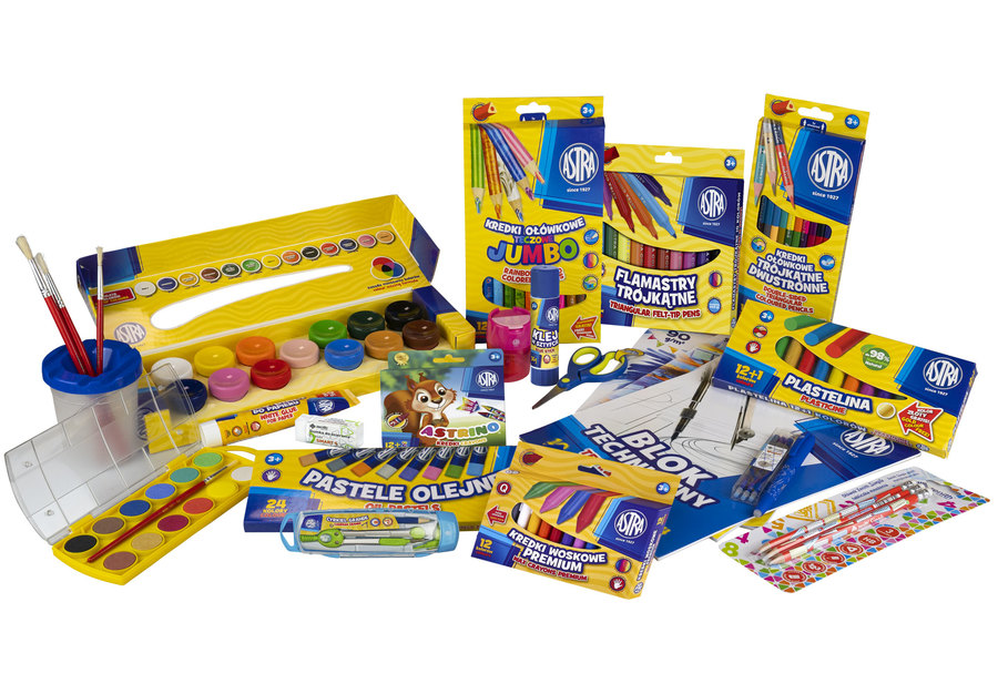 Wyprawka szkolna ASTRA dla pierwszoklasisty składająca się z 23 elementów jest doskonałym rozwiązaniem przy kompletowaniu akcesoriów dla dziecka. Producent, firma Astra, jest gwarantem najwyższej jakości produktów. W skład zestawu wchodzą aż 23 elementy: