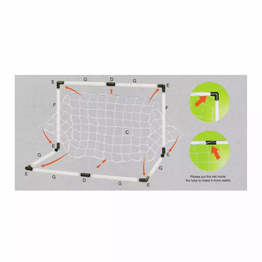 Bramka o szerokości 70 cm została wyposażona w niezbędne akcesoria, które umożliwiają szybki montaż i natychmiastowe rozpoczęcie gry.