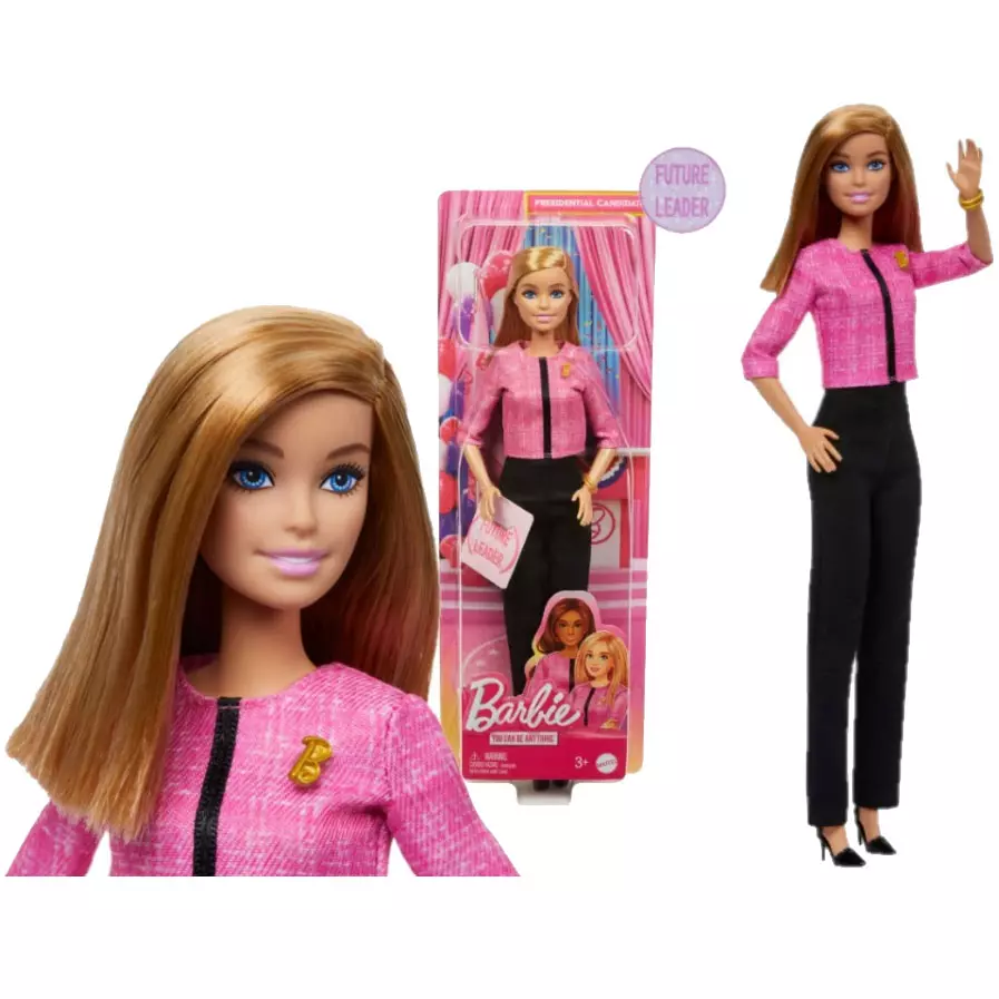 Barbie Liderka przyszłości Lalka blondynka z 2 złocistymi bransoletkami i przypinką „B” oraz naklejką dla dzieci Z lalką Barbie® Liderką przyszłości dzieci mogą odkrywać nowe kariery przywódcze i wspiąć się na sam szczyt! Barbie® inspiruje do wymyślania niezliczonych opowieści, od niezapomnianych momentów kampanii po wieczór wyborczy i podejmowanie ważnych decyzji.