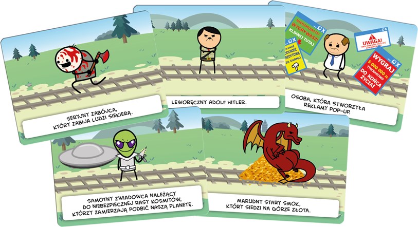 Dylemat wagonika: Postacie i modyfikatory to pokaźny zestaw kart, które wyniosą Wasze rozgrywki na zupełnie nowy poziom! W rozszerzeniu znajdziesz 100 nowych okropnych postaci i 100 nowych nawet okropniejszych modyfikatorów, które uczynią rozjeżdżanie ludzi na torach jeszcze ciekawszym. Oczywiście wszystko w ramach czarnego humoru, ironii i żartów rodem z internetowego komiksu Cyanide and Happiness. Ostrzegaliśmy!