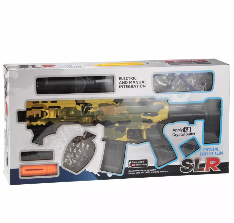 Zawartość zestawu: karabin, okulary ochronne, magazynek na pociski wodne.