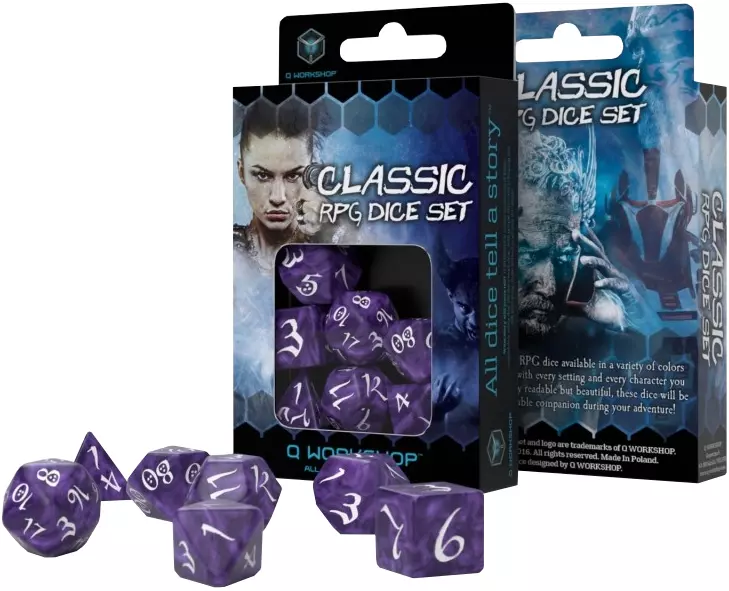 zestaw 7 różnych kości w kolorze lawendowo-białym