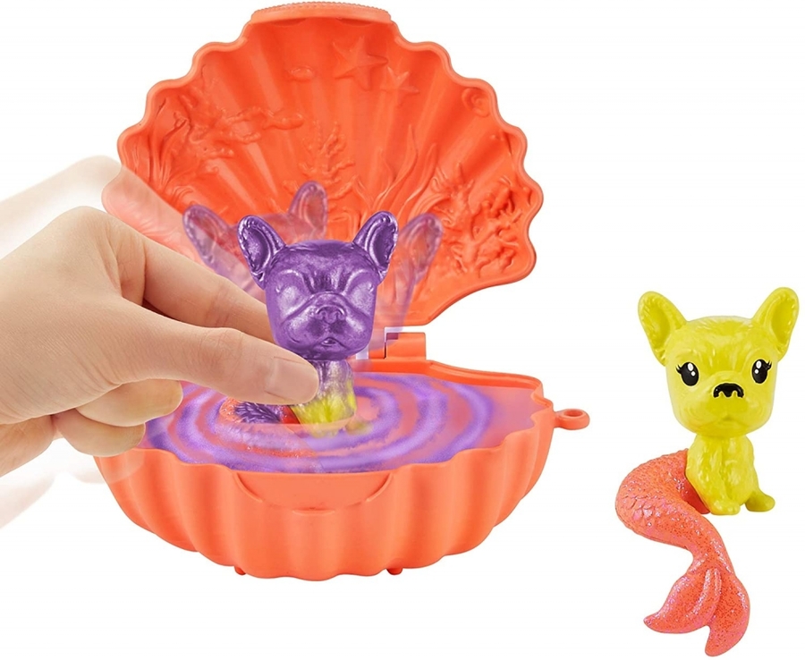 Metaliczne zwierzątko-syrenka z linii Kolorowa niespodzianka Color Reveal, ręczniczek, korona i jedno dodatkowe akcesorium, np. naszyjnik. Ale to nie koniec niespodzianek! Aby zobaczyć, na jakie zwierzątko-syrenkę trafiły, dzieci muszą włożyć je do ciepłej wody i poruszać nim. Woda zmieni kolor i odkrywa wygląd zwierzaka! Wyciągnij figurkę – każda z nich jest zainspirowana innym zwierzątkiem i ma kolorowy syreni ogonek. Dzięki dołączonym akcesoriom możesz wymyślać własne historyjki i prezentować zwierzątko w muszelce.