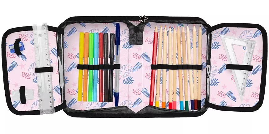 Klasyczny piórnik jednokomorowy, rozkładany, z dwoma klapkami wewnątrz. Bogato zdobiony. Piórnik pomieści najpotrzebniejsze akcesoria szkolne.