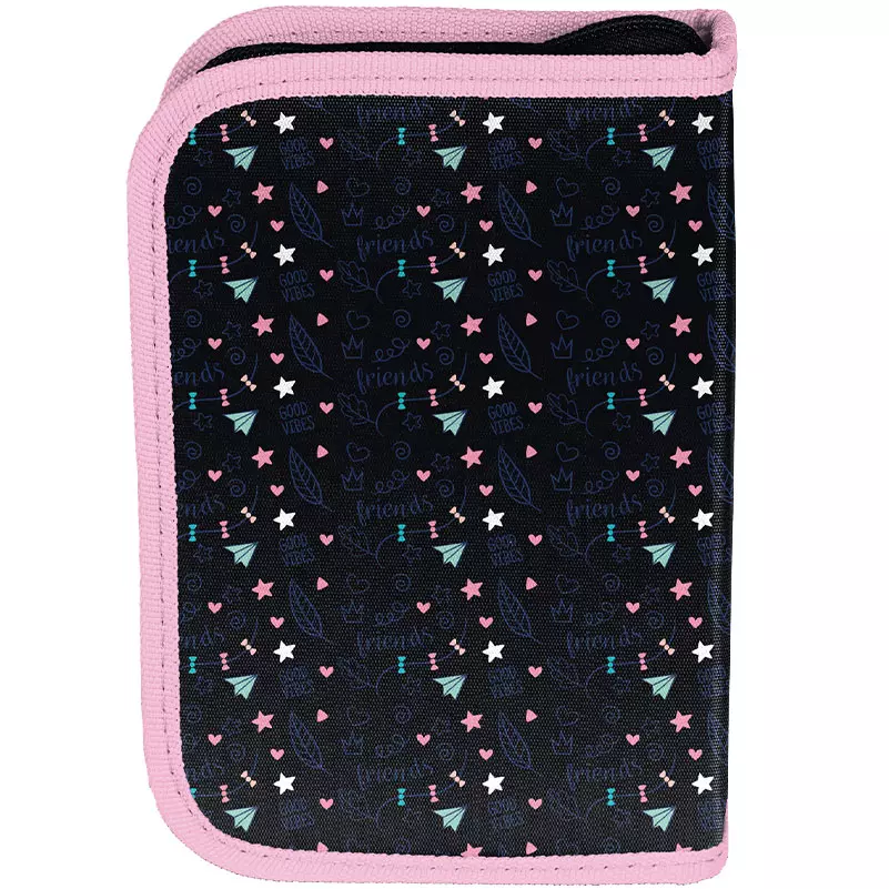 Klasyczny piórnik jednokomorowy, rozkładany, z dwoma klapkami wewnątrz. Bogato zdobiony. Piórnik pomieści najpotrzebniejsze akcesoria szkolne.
