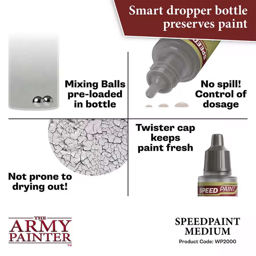 Speedpaint 2.0 - Medium to innowacyjne medium żywiczne, które pozwala rozcieńczyć farby Speedpaint do pożądanej konsystencji. Ułatwia wykonywanie technik, takich jak glazing czy zmiana intensywności koloru. Farba jest w specjalnie zaprojektowanym, nierozlewającym się flakoniku z zakraplaczem i dwoma stalowymi kulkami w środku, które ułatwiają rozmieszanie zawartości.